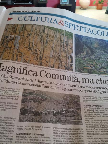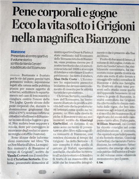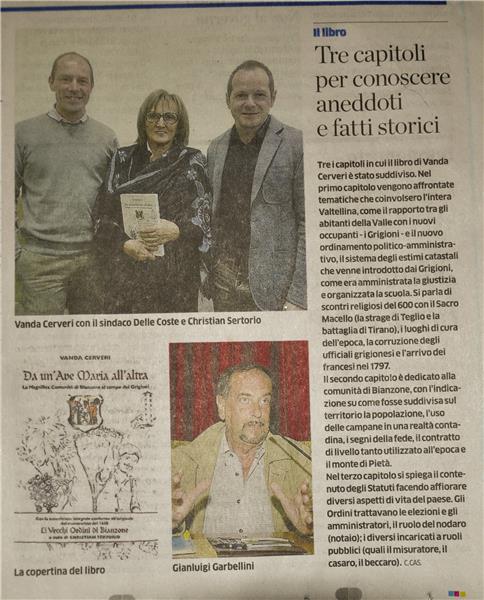Sono diverse le informazioni contenute nel libro “Da un’Ave Maria all’altra. La magnifica comunità di Bianzone al tempo di Grigioni”, scritto da Vanda Cerveri con il contributo di Christian Sertorio, la maggior parte delle quasi provenienti da un manoscritto del 1638 trovato nell’archivio storico di Sondrio e tradotto integralmente. Questo libro è un omaggio alle radici contadine di Bianzone, all’apparente benessere in cui viveva la gente, in realtà controllata dai Grigioni, alla ricchezza data dalle vigne, al lavoro e al sacrifici dei bianzonaschi, al significato del suono delle campane e tanto altro.