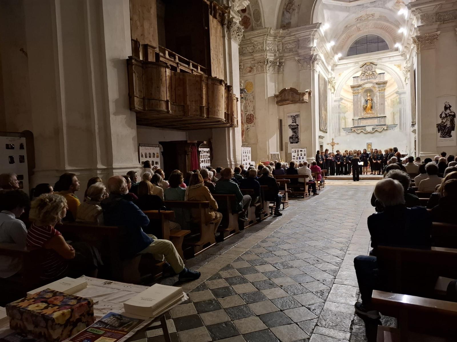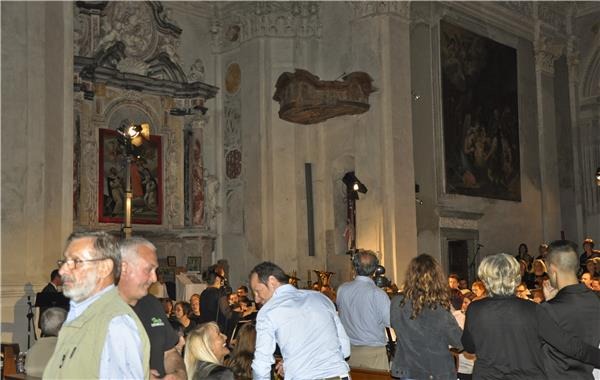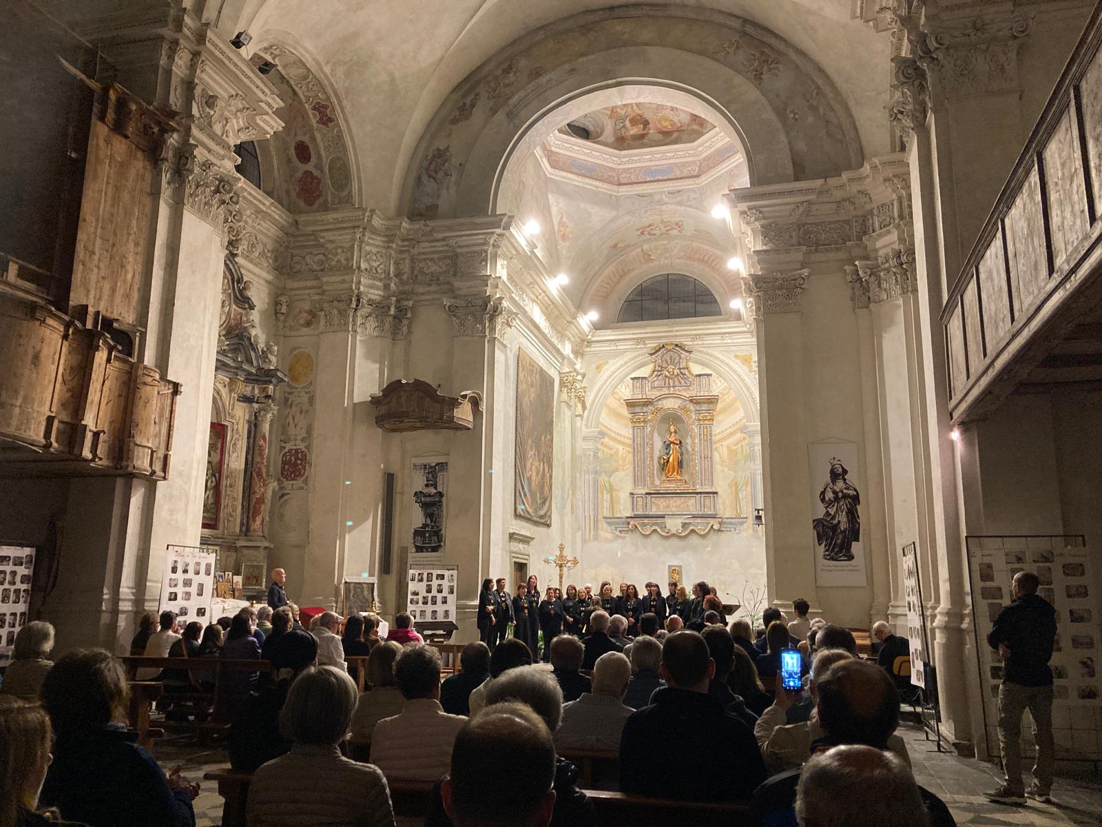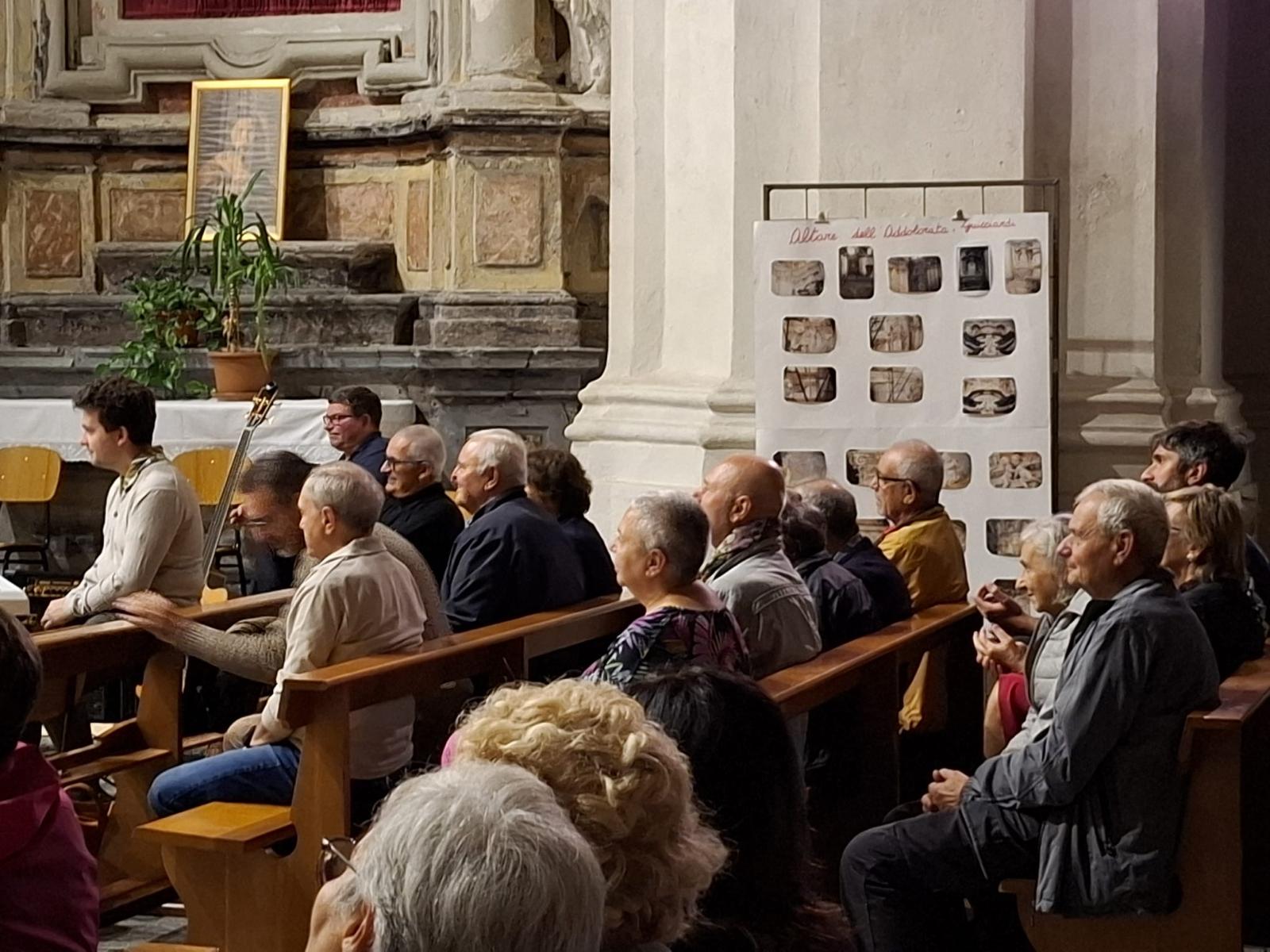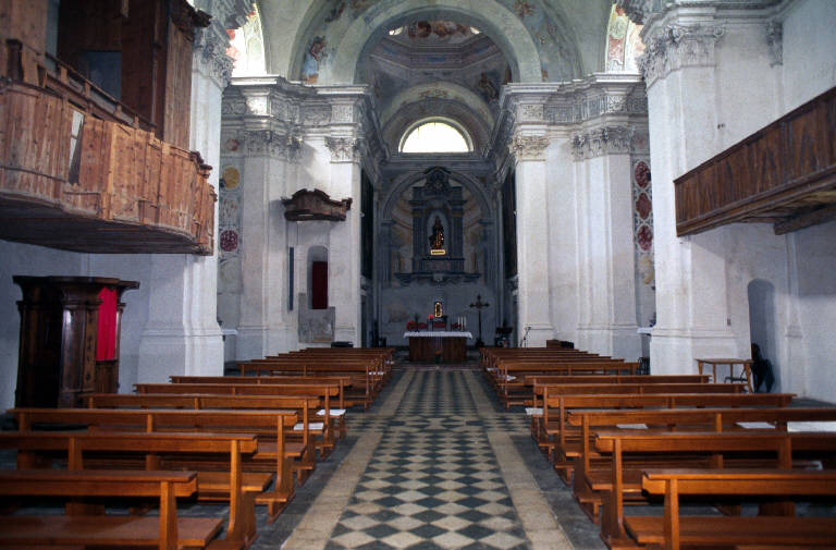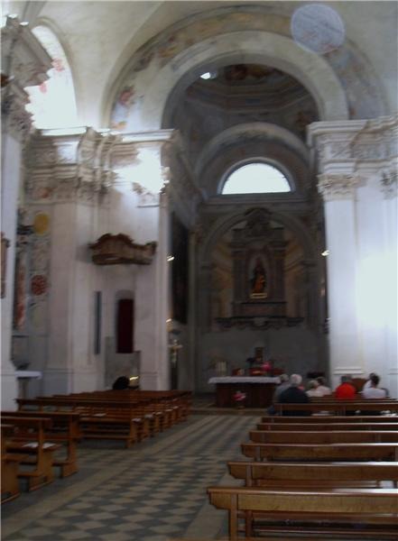 L’interno della chiesa è caratterizzato da un’ampia e luminosa navata unica con sei cappelle laterali, ricavate nello spessore dei muri e comunicanti tra loro. Nella cappella centrale di destra si trova una modesta cantoria e i resti di un organo settecentesco. Nelle altre cappelle ci sono quattro altari in gesso scagliola, tutti della seconda metà del Settecento. Il primo altare a destra è dedicato a San Francesco, mentre il successivo, dedicato alla Madonna Addolorata, conserva un’interessante predella in pietra lavorata e lo stemma della nobile famiglia Guicciardi. Sopra l’altare maggiore, gli affreschi della cupola raffigurano l’Assunzione della Vergine, con gli Apostoli in basso.